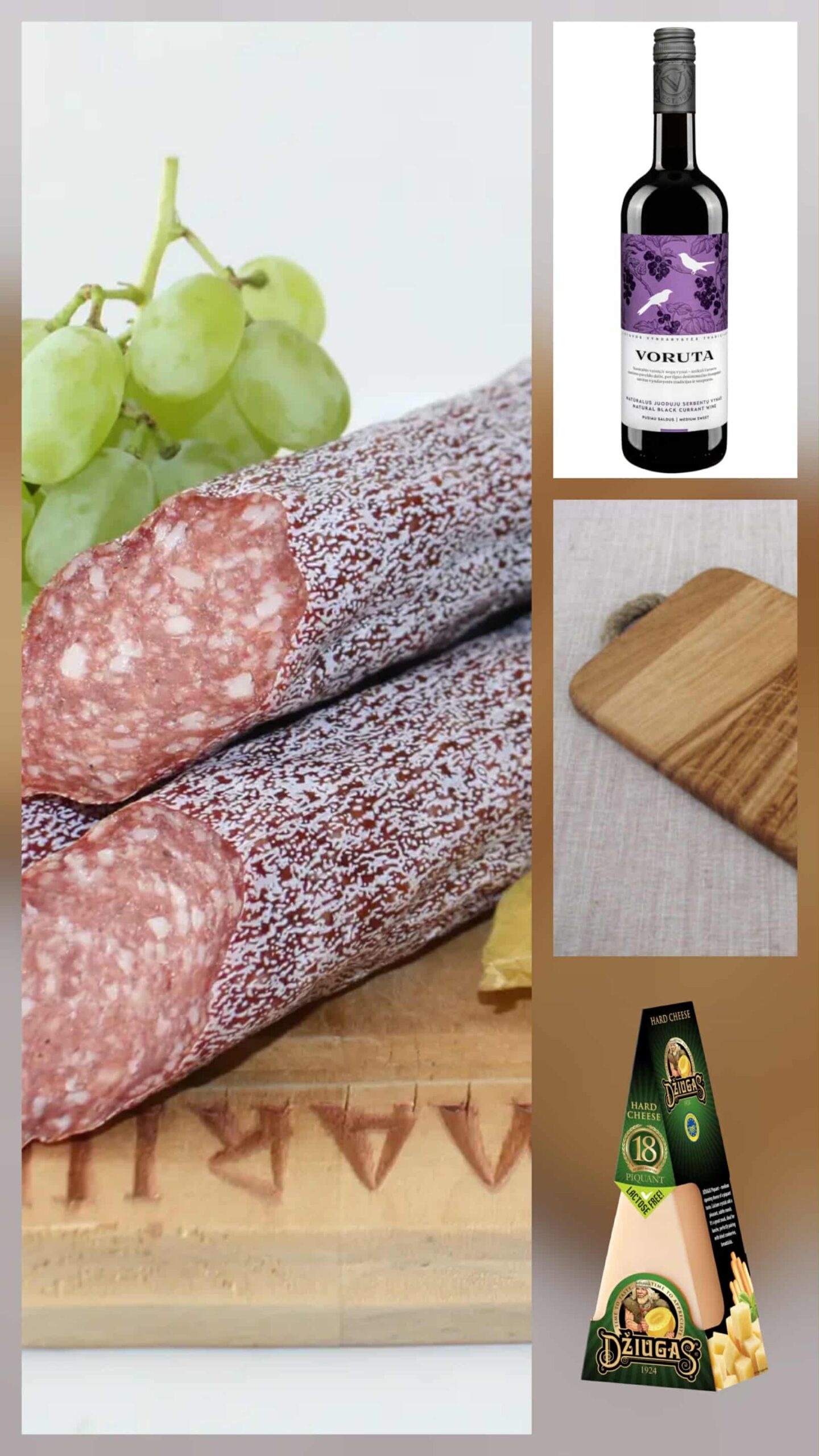 Rinkinys „Piknikas su kaimiška dešra, sūriu ir vynu“ gali būti puikus pasirinkimas linksmam laikui gamtoje. Puošniai supakuotame rinkinyje rasite: