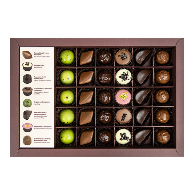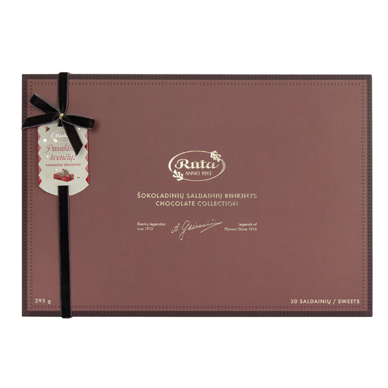 Subtilios elegancijos dėžutėje, dekoruotoje aukso spalvos elementais ir prabangiu kaspinėliu, rasite 30 šokoladinių saldainių. Iš viso rinkinyje – 8 rūšių saldainiai, kuriuos vienija nuoširdus dėmesys detalėms ir skoniui. Dėžutę puošia šventinė kortelė su šiltu palinkėjimu – „Pasakiškų švenčių!“, o jos vidų – įmonės legenda.